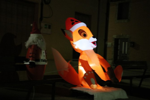 El zorro con cara travieso, papas noeles y muñecos de nieve sonrientes acompañan en un recorrido que muestra orgulloso la tradición leonesa con un gran ramo frente a la iglesia.