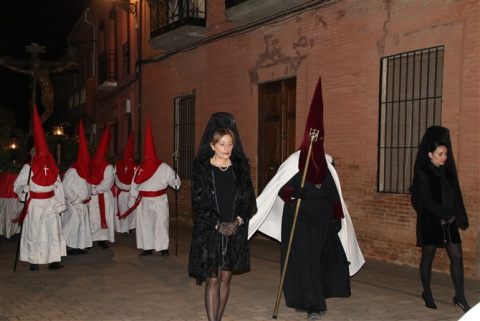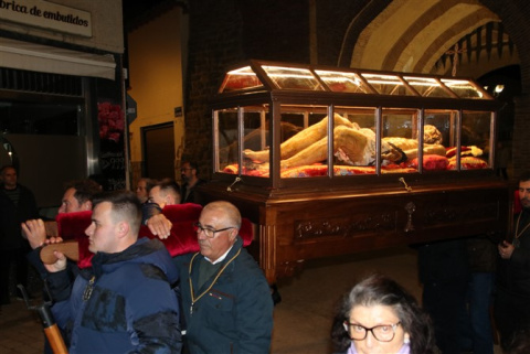El silencio solo lo rompen las cornetas y tambores de la Cofradía de Jesús Nazareno. La Vera Cruz abre el camino, y las Manolas enlutadas son símbolo del dolor. Los más pequeños de la Cofradía de Jesús Nazareno empujan el paso de Los Atributos. El Cristo de la Concha, crucificado, es portado por la cofradía de San Blas y la urna con el Yacente es portado por cofrades del Santísimo que iluminan el camino con faroles.