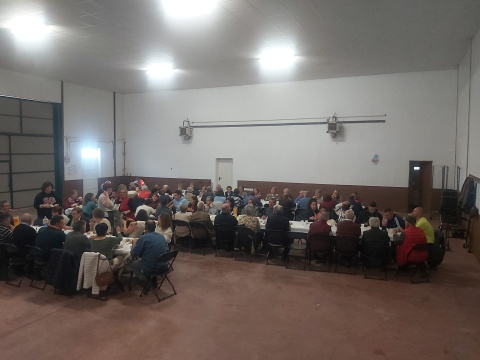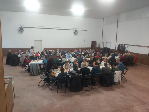 Tras los actos religiosos, se ha repartido en el Salón del Baile, el bocadillo de escabeche, cacahuetes, pastas y orujo.