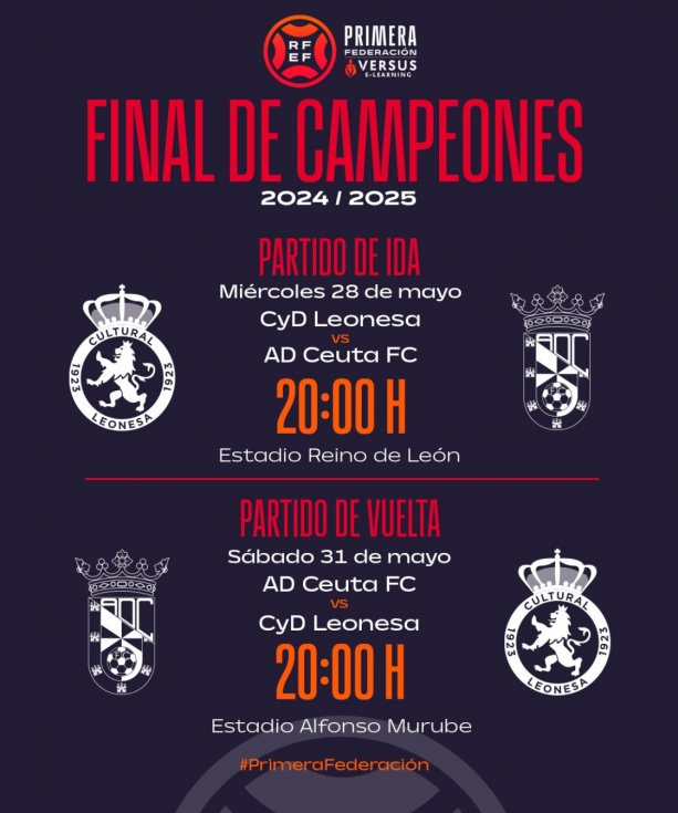 El partido de ida se jugará en el Reino de León el miércoles 28 de mayo a las 20:00h, y la vuelta tendrá lugar en el Alfonso Murube de Ceuta el sábado 31 de mayo a las 20:00h.