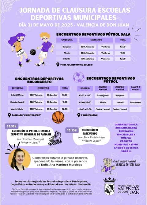 El próximo lunes 2 de junio a las 18:30 horas, el Pabellón Municipal "Vicente López" de Valencia de Don Juan acogerá la esperada Exhibición de Clausura de las Escuelas Deportivas Municipales de Gimnasia Rítmica.