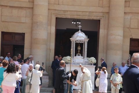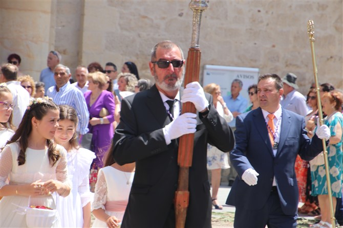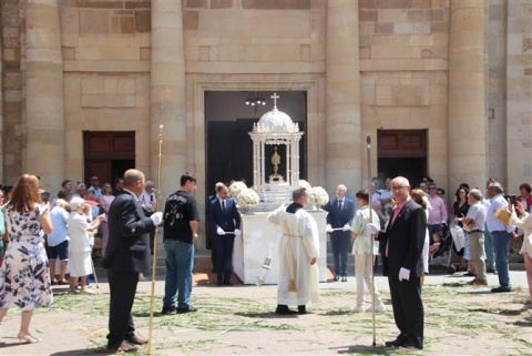 Tras el Santísimo las autoridades, éste fue el primer acto presidido por el nuevo alcalde, José Jiménez. El recorrido fue el tradicional con dos paradas en los altares preparados para regresar a la parroquia de San Pedro Apóstol.