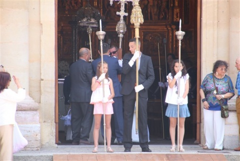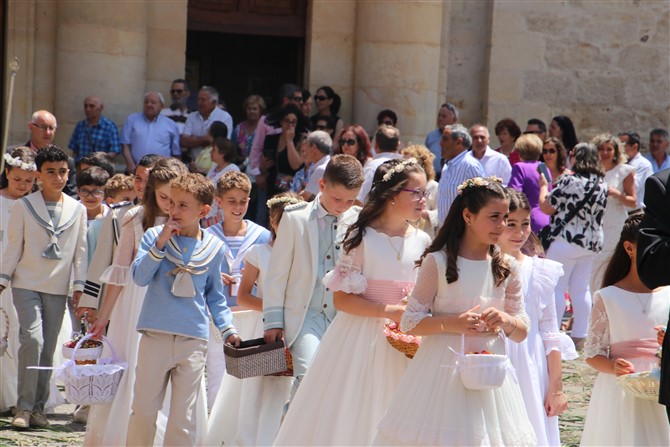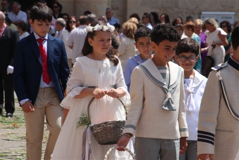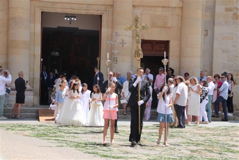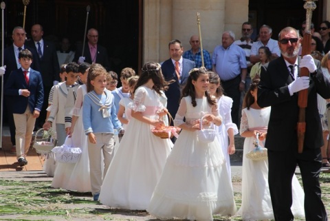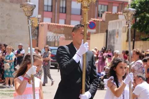 No pudo brillar más el sol en el Corpus este año. Valencia de Don Juan con el inconfundible olor a tomillo esperó impaciente la procesión del Corpus. Los dos altares preparados para la llegada del Santísimo en una mañana calurosa en la que la sombra era la mejor aliada.