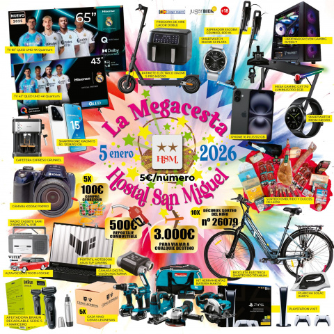 Entre los artículos más destacados se encuentran televisores de última generación de 65 pulgadas y otra de 45, modernas mesas de sonido, bicicletas, cámaras de vídeo, vino, vales de compra, lotes de embutido, patinete, freidora de aire y numerosos décimos de lotería... entre otros muchos más atractivos.,Además, uno de los grandes regalos es un bono por valor de 3.000 euros para viajar a cualquier destino del mundo, permitiendo al ganador cumplir ese sueño pendiente o planificar unas vacaciones inolvidables.