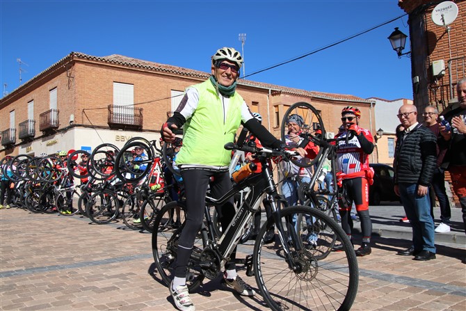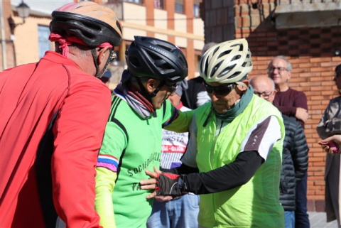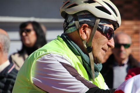 Cuando todo estuvo listo y las ruedas en alto, llegó el homenajeado escoltado por dos de sus nietos. La emoción fue visible en el rostro de Benito que agradeció la sorpresa. Mucha emoción para el veterano ciclista que no paraba de mirar a un lado y a otro, sorprendiéndose aún más, por los rostros que descubría sobre cada bicicleta.