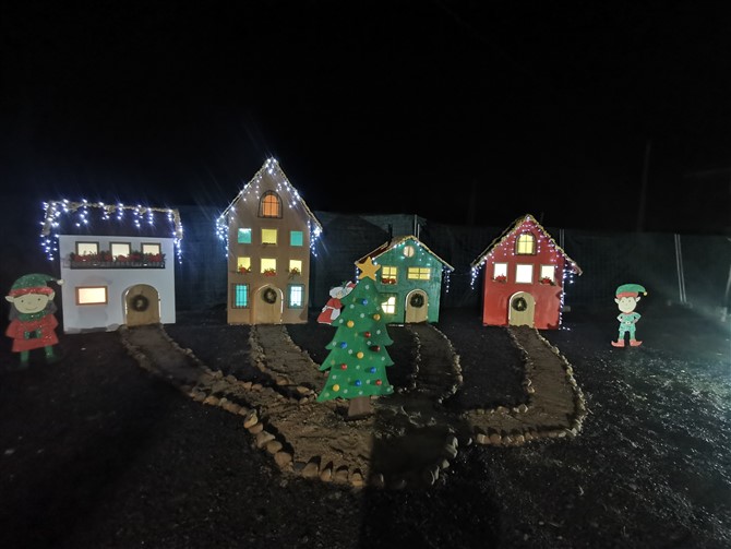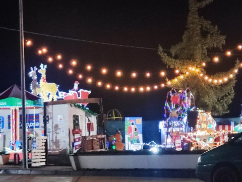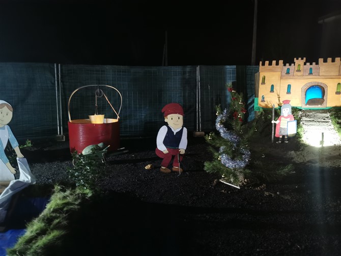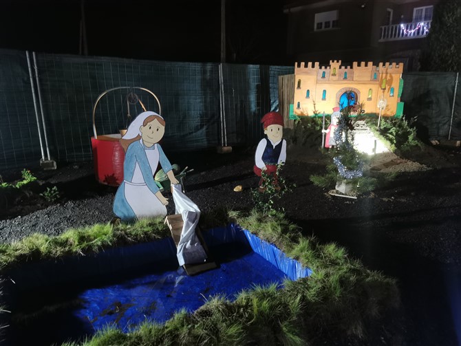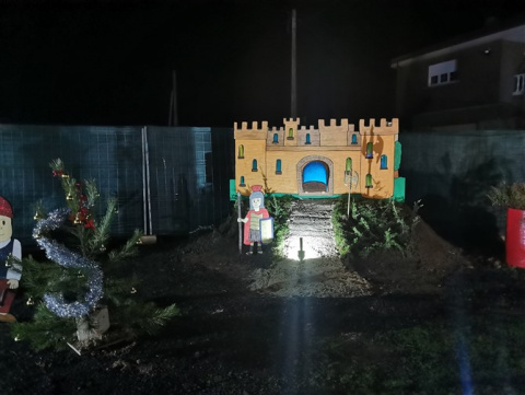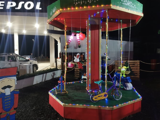 Este poblado nació con la idea de homenajear y agradecer a sus vecinos y clientes. La familia Pellitero celebra este año su 40 aniversario al frente de la gasolinera. Al frente el matrimonio Santiago y Merche acompañados de sus tres hijos. Tras una celebración muy especial en agosto que resultó ser todo un éxito y que contó con una paellada, discoteca, concentración de clásicos y food trucks decidieron hacer algo especial para Navidad. Y así, manos a la obra, comenzaron el proyecto. En apenas dos meses la familia junto con Alejandro y Elena han creado a mano un poblado navideño. Los materiales básicos: tableros , pintura y dibujos propios. También algún que otro tubo de riego (esa noria es puro campo). El resultado un conjunto que tiene portal propio, río, noria, tiovivo, trineo, castillo, pozo…