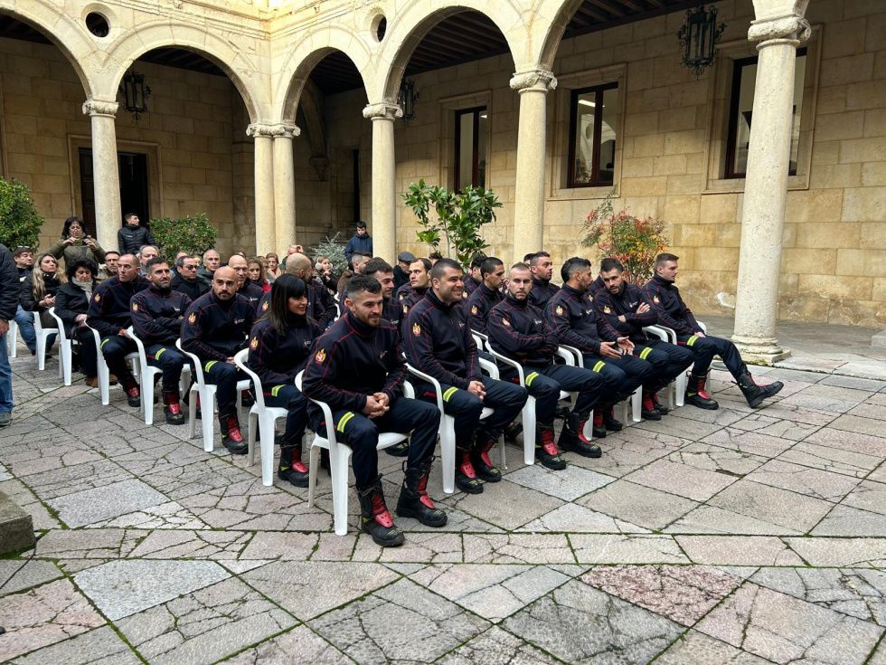 La Diputación de León ha celebrado este miércoles en el patio del Palacio de los Guzmanes el acto oficial de recibimiento a los 25 nuevos bomberos del Servicio de Prevención, Extinción de Incendios y Salvamento (SEPEIS), que en las próximas semanas se incorporarán a sus destinos en los diferentes parques de bomberos de la provincia.