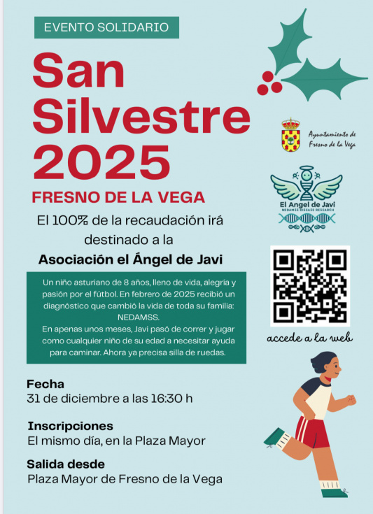 Fresno de la Vega volverá a combinar deporte y solidaridad el próximo 31 de diciembre con la celebración de la San Silvestre 2025, una prueba popular que tendrá un marcado carácter benéfico. El 100 % de la recaudación irá destinado a la Asociación "El Ángel de Javi", que impulsa la investigación de la enfermedad rara NEDAMSS.