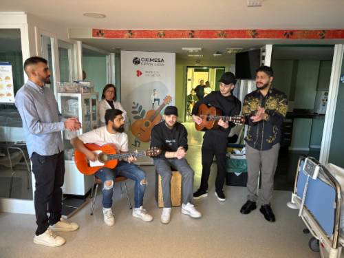 Este lunes, 29 de diciembre, el Hospital de León ha acogido la actuación del grupo de rumba y flamenco Los Taberneros, que ha ofrecido un repertorio variado, compuesto principalmente por conocidos temas, incluidos villancicos, en la Unidad de Hemodiálisis y en la sala de espera de Oftalmología, generando una gran expectación y arrancando aplausos y felicitaciones tanto de los pacientes como del personal.