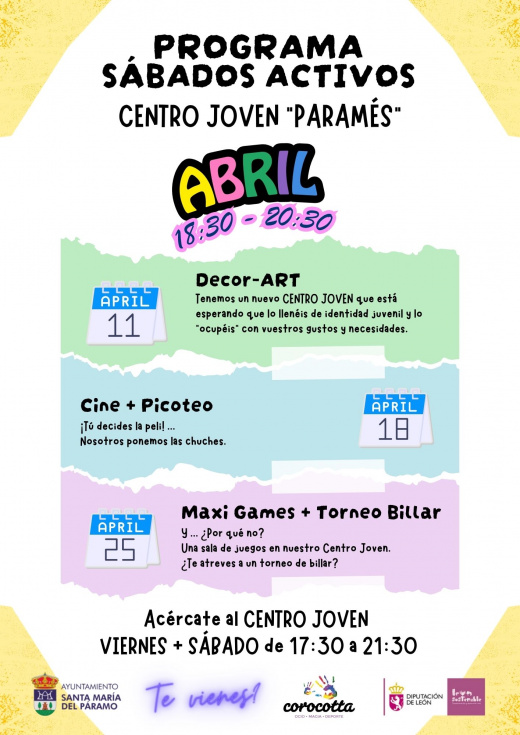 Desde el Ayuntamiento se facilita las actividades dirigidas que se realizarán en el mes de abril en el Centro Joven Paramés de 18:30 a 20:30 son: