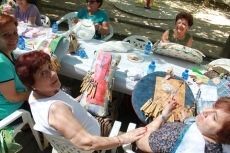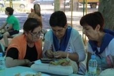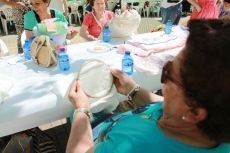 [Img #16012]Así, entre vuelta y vuelta, con los 'niños' (así denominan las encajeras el soporte donde colocan los alfileres que servirán de guía para 'encajar' el hilo en la labor) las encajeras lucieron algunos de sus trabajos. Cuellos, pañuelos, abanicos, mantillas... todo lo que la imaginación permita. ¡Hasta un Belén! pudo admirarse ayer en uno de los puestos de artesanía.