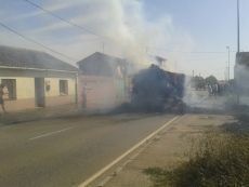 El vehículo transitaba en la carretera de salida de Valderas dirección Benavente. El tractor, y la plataforma que transportaban, quedaron calcinadas por completo.