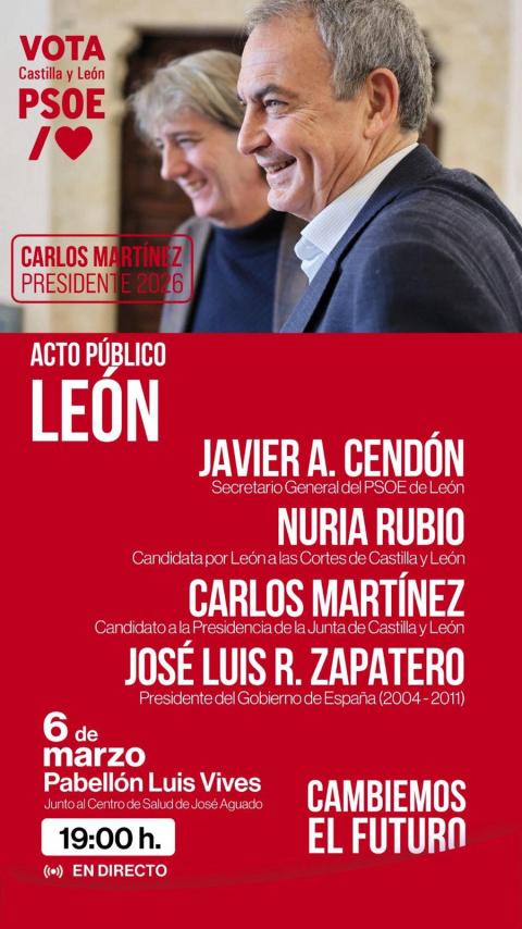 El expresidente del Gobierno participa en un multitudinario acto en León junto al secretario general del PSOE leonés, Javier Alfonso Cendón, la [...] Leer más...